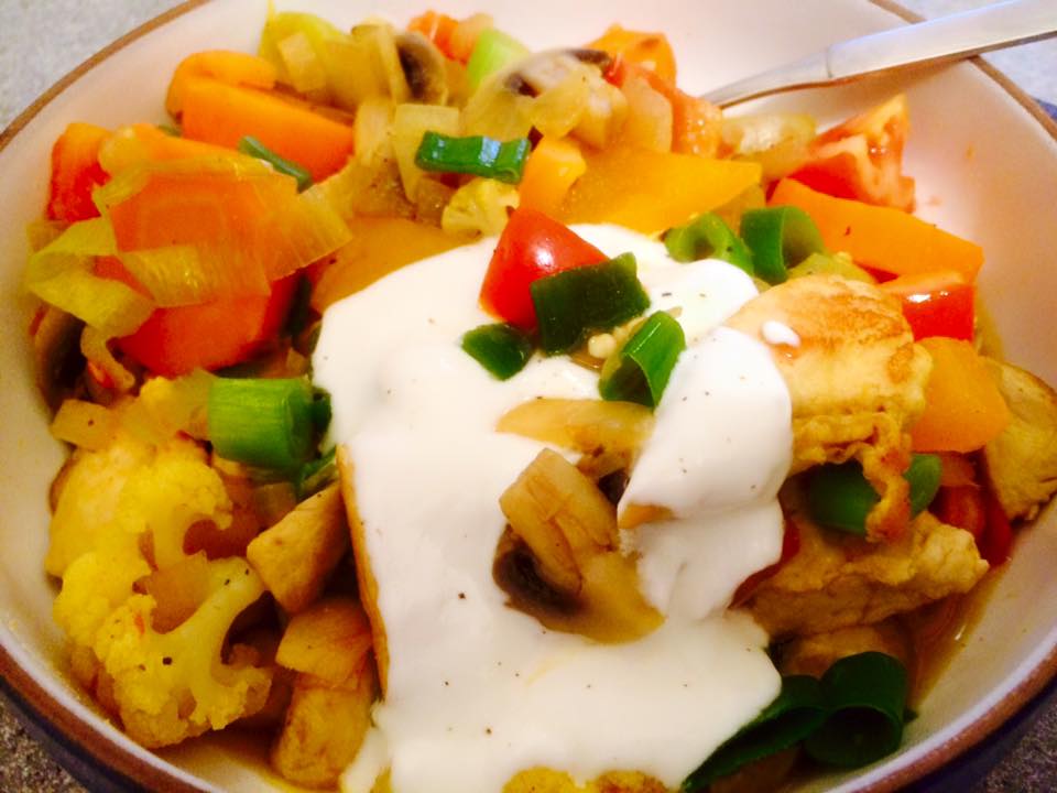 Die Hühnerbrust mit Currypaste marinieren und anschließend in kleine Stücke schneiden und anbraten . Das Gemüse ebenfalls schnippeln.