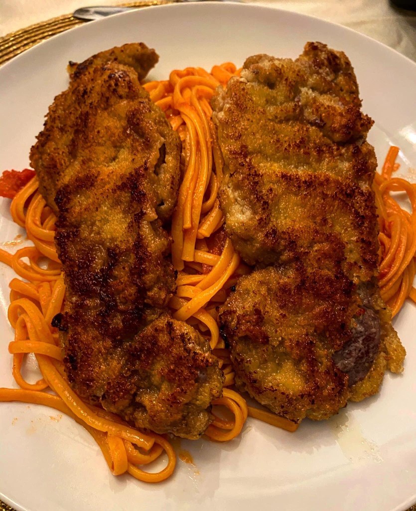 - Kaltes Schnitzel vom Kalb, hauchdünn geklopft, natur gebraten, in Streifchen schneiden