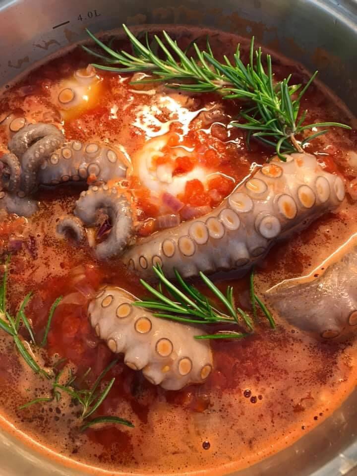 Den Pulpo in mundgerechte Stücke schneiden und mit den Tomaten zusammen in den Topf geben, weiter 5 Minuten köcheln lassen.