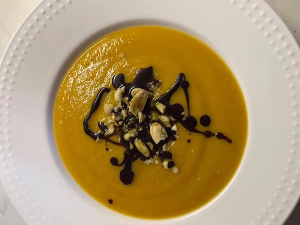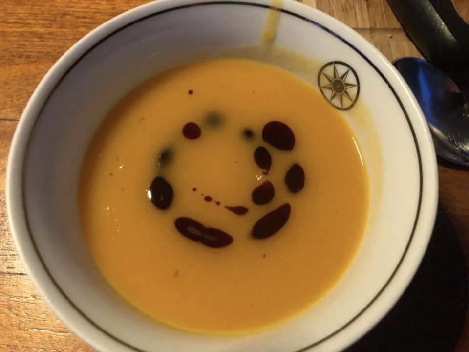 and a Bloody Orange Pumpkinsoup – Kürbissstückchen aus Hokkaido, große mehlig kochende Kartoffeln, geschält gestückelt, zusammen mit in Olivenöl glasig gedünsteten Knoblauchzehen und Schalotten, je 2, in eine tiefe große Pfanne oder Topf geben, mit Bratenfond und Gemüsebrühe – alles selbst gemacht – auffüllen, 30 bis 45 Minuten kochen, mit Sojasauce, Salz, schwarzem Pfeffer, rosenscharfem Paprika, Currypulver, Zitronensaft einer halben Zitrone und etwas Blutorangensaft gründlich abschmecken, gerne mehrmals, nach Wunsch Schlagsahne angießen und bei großem Feuer reduzieren bis die soup sämig wird.