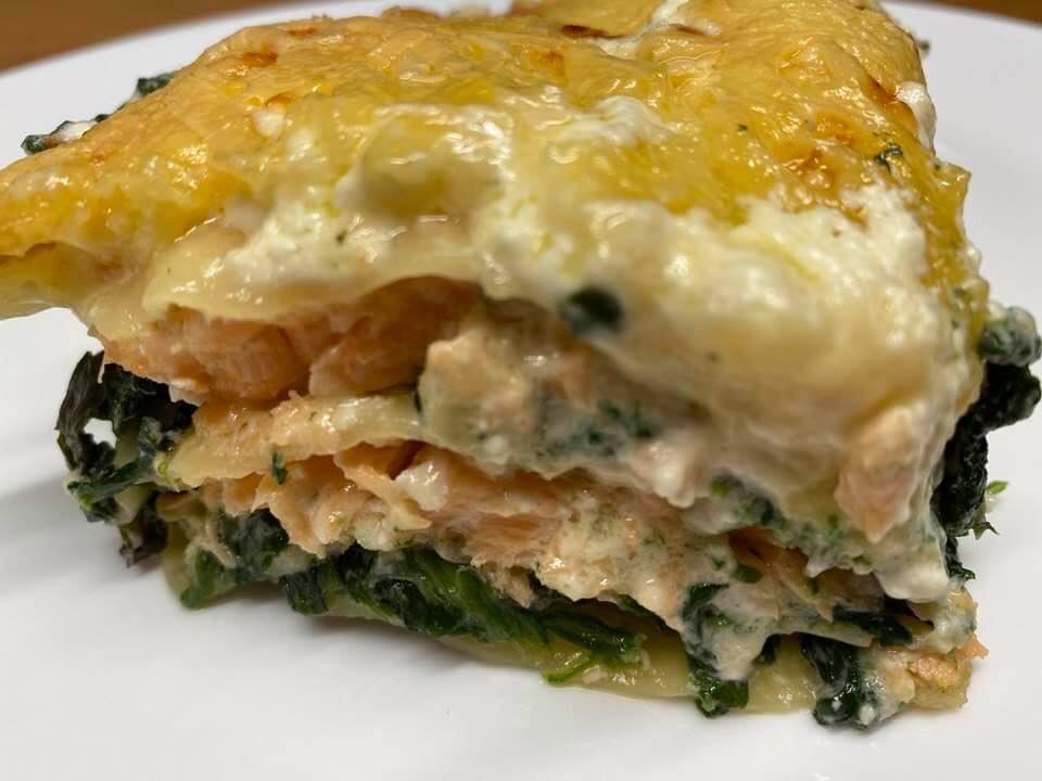 Spinat in einen Topf geben und bei schwacher Hitze auftauen lassen. Mit Salz, Pfeffer und Gewürzen nach Wahl abschmecken. Den Lachs nur leicht antauen lassen, dann in Stücke schneiden. Unterste Schicht der Lasagneform mit Lasagneplatten belegen, sodass der Boden bedeckt ist. Dann Lachs und Spinat draufgeben, fortführen, bis die Form fast voll ist. Letzte Schicht sollte eine Lasagneplatte sein. Auf dieser dann die Creme fraiche verteilen, Käse drüberstreuen und für 40-50 Minuten in den auf 180°C vorgeheizten Backofen schieben.