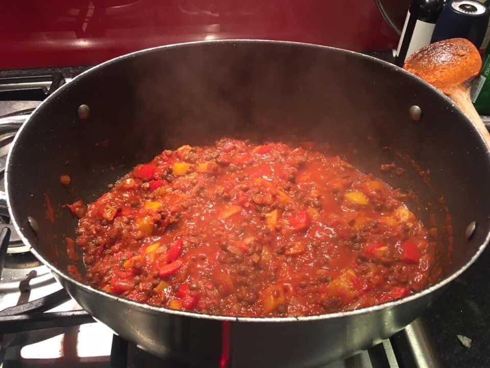 Im Topf die klein gewürfelte Zwiebel mit Olivenöl glasig werden lassen und anschließend Tomatenmark und die klein geschnittenen getrockneten Tomaten dazugeben und ein bisschen weiter brutzeln. Dann die Kichererbsen und Linsen in den Topf geben und mit 1,5 Tassen Wasser auffüllen. Gemüsebrühe für 500 ml Wasser hineingeben, wenn das Wasser zu kochen beginnt. Kochzeit ca. 1 Stunde.