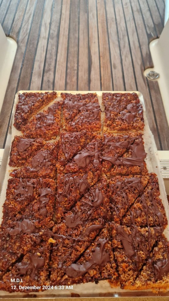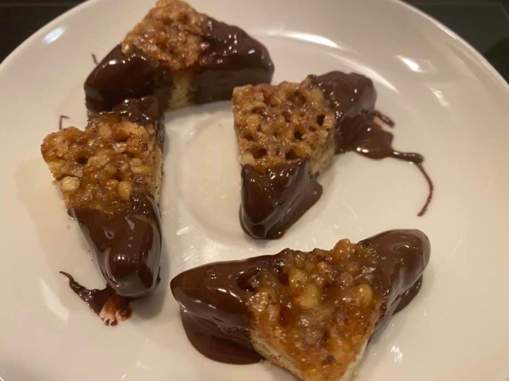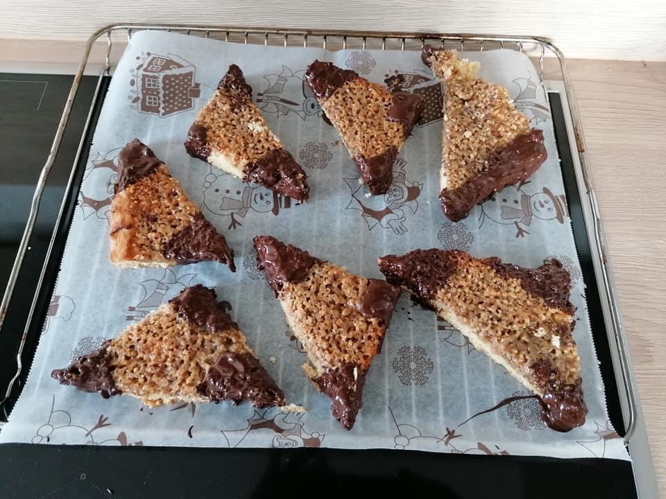Nach dem Backen direkt den entstandene Nussplatte mit einen Messer in Dreiecke schneiden und vollständig abkühlen lassen, die Schokolade im Wasserbad schmelzen lassen und über die Nussecken verteilen.