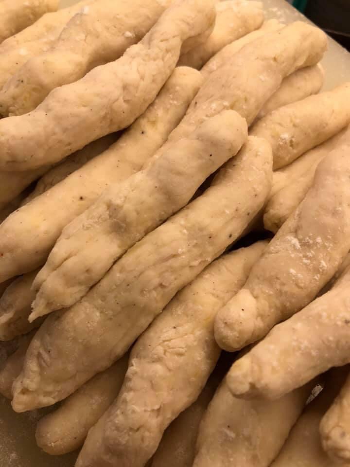 Auf einer bemehlten Arbeitsplatte den Teig zu einer Wurst rollen und 1/1.5 cm dicke Stücke abtrennen und in der Hand rollen .. zu Würsten/ wie schupfnudeln ..