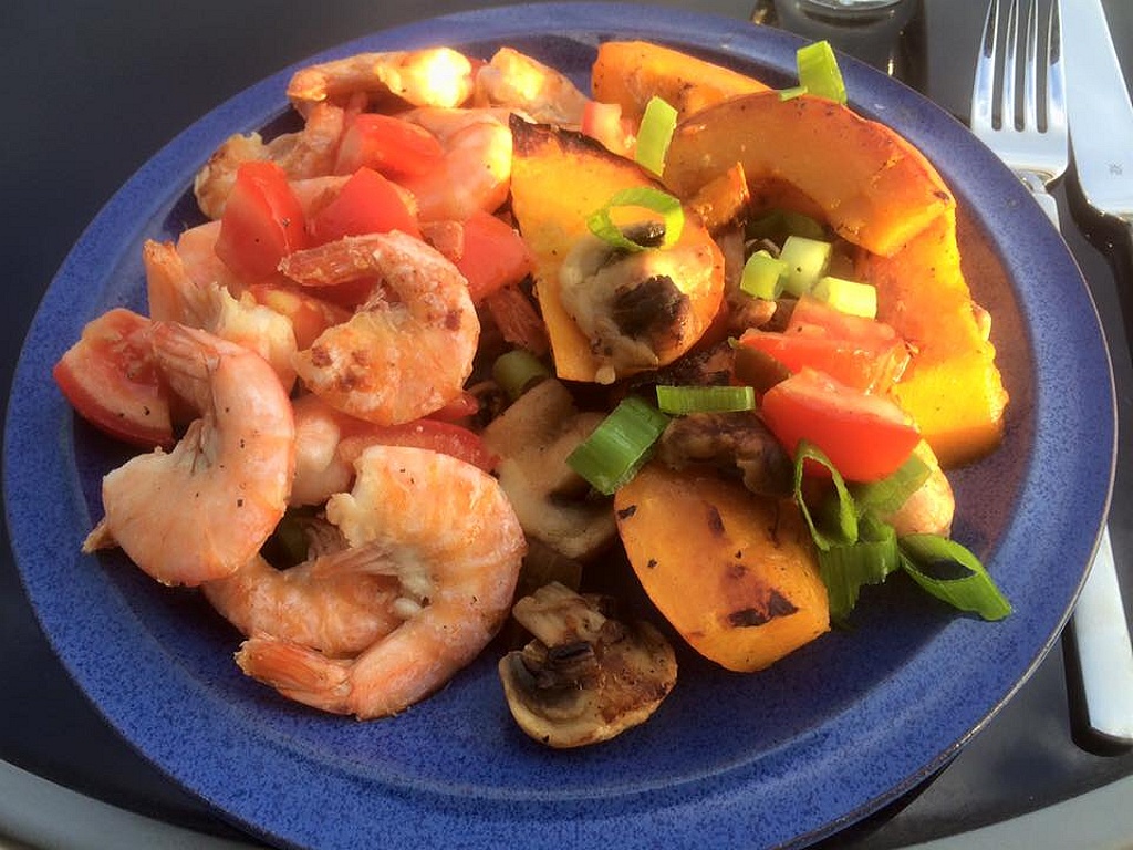 Eine Zwiebel schälen, würfeln, in Olivenöl anbraten. Dann einen halben Hokkaido- Kürbis von den Kernen und dem matschigen Inneren befreien, in mundgerechte Stücke schneiden, in etwa so wie bei Bratkartoffeln. Kürbis zu den angebratenen Zwiebeln geben und mit anbraten, mit Meersalz salzen und ordentlich pfeffern, zwei Knoblauchzehen fein reinschnippeln, Champignons vierteln und rein in die Pfanne. Wenn alles gut angebraten ist, minimal Wasser dazu, damit nix anbrennt. Wenn der Kürbis weich aber noch bissfest ist, eine gewürfelte Tomate dazugeben und ganz kurz mit anschwenken. Gemüse ist soweit fertig, am Ende kommen noch Lauchzwiebeln drüber. In der gleichen Zeit wird in einer zweiten Pfanne Olivenöl heiß gemacht, Scampis mit viel Knoblauch und Salz und Pfeffer würzen, braten.. Mahlzeit!