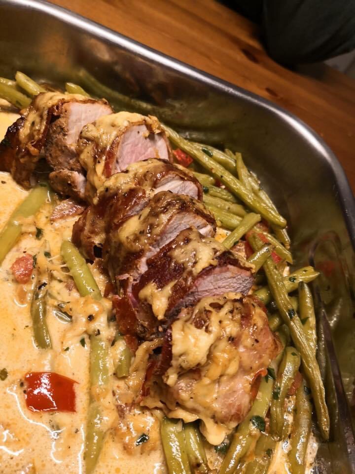 Das Gemüse in eine Ofenform geben. Das Filet darauf setzen. Bratensatz mit Wein und Sahne ablöschen, aufkochen und abschmecken. Soße über das Fleich geben, Geriebenen Gouda drauf. Im vorgeheizten Backofen bei 225°C 10-12 Min. überbacken.