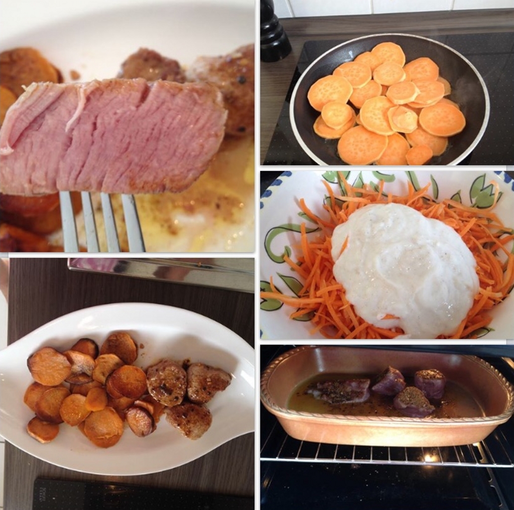 Das Gemüse in eine Ofenform geben. Das Filet darauf setzen. Bratensatz mit Wein und Sahne ablöschen, aufkochen und abschmecken. Soße über das Fleich geben, Geriebenen Gouda drauf. Im vorgeheizten Backofen bei 225°C 10-12 Min. überbacken.