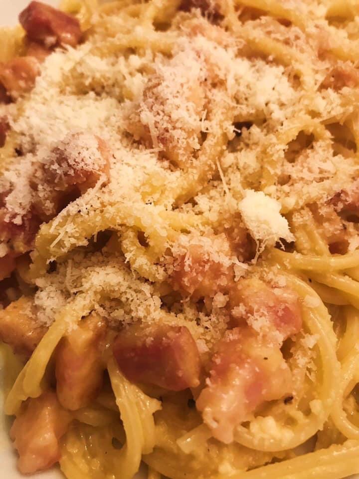 Die gekochten Spaghetti abtropfen lassen und in die Pfanne mit dem Rückenspeck geben, die Pfanne von der heißen Herdplatte nehmen. Spaghetti und Speck vermischen und jetzt die Eimischung dazugeben. Schnell verrühren, so dass das Ei nicht stockt, auf Teller geben und dann noch Parmesan darauf.