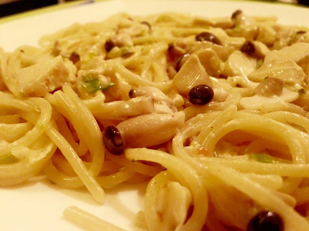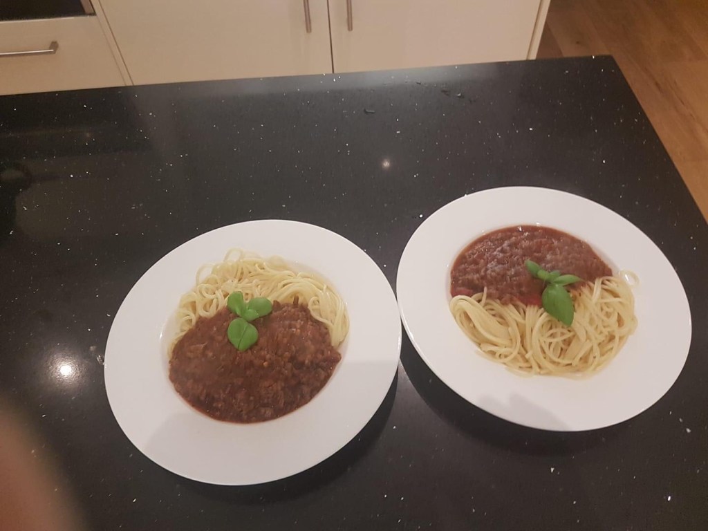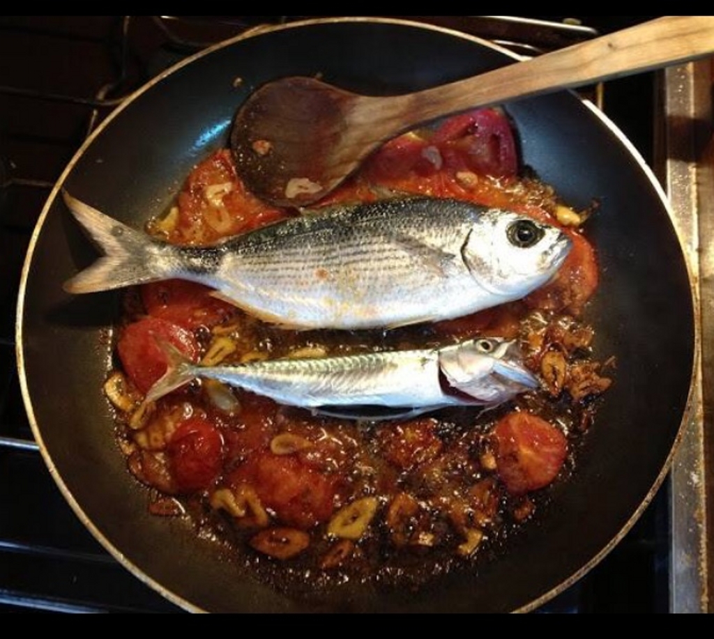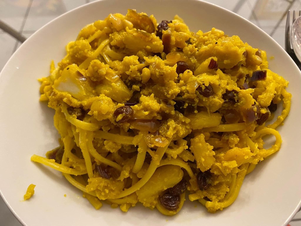 Sophia gibt die Sardellenbutter nun in eine große Schüssel und vermengt sie sofort mit den heißen Spaghetti, gibt dann die ebenso heiße Tomatensauce und die Hälfte der Petersilie sowie den gemörserten Pfeffer hinzu und vermischt det janze. Ich habe die Hauptingredienzen auf einem Teller arrangiert und die Tomatensauce in einer Sauciere beigestellt. Erst bei Tisch wurde alles vermengt, noch mal gehackte Petersilie obenauf gegeben und mit Meersalz verfeinert.