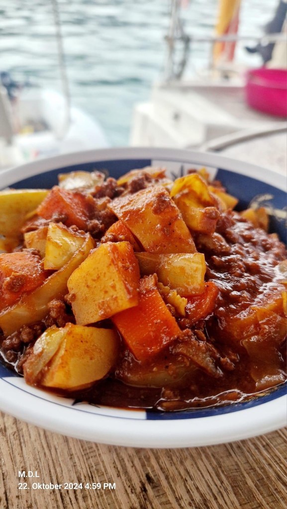 Hack, Zwiebeln, Knoblauch und Gewürze anbraten, das gesamte Gemüse dazu und mit der Brühe ablöschen, Deckel drauf und 25 Minuten kochen.